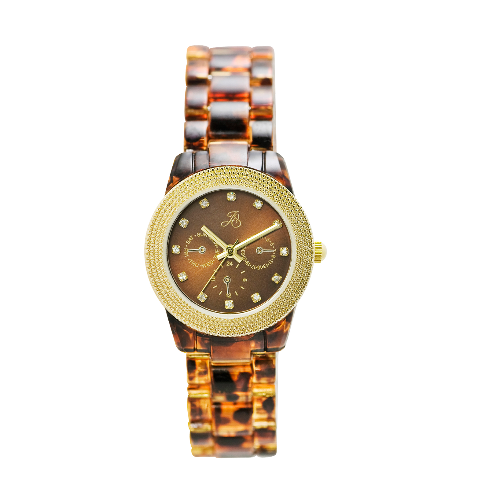 Related Product Jaclyn Smith Ladies Gold Plated Round Textured with Stones on the Hour Markers and Tort Look Bracelet Watch, Women's